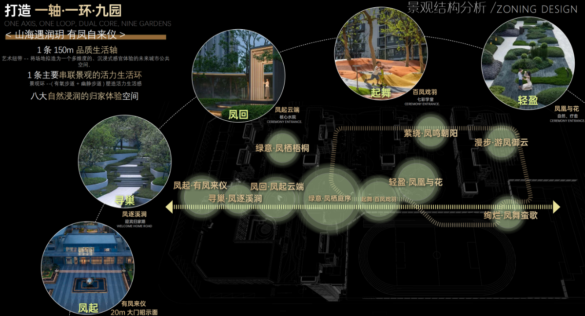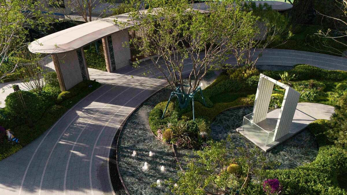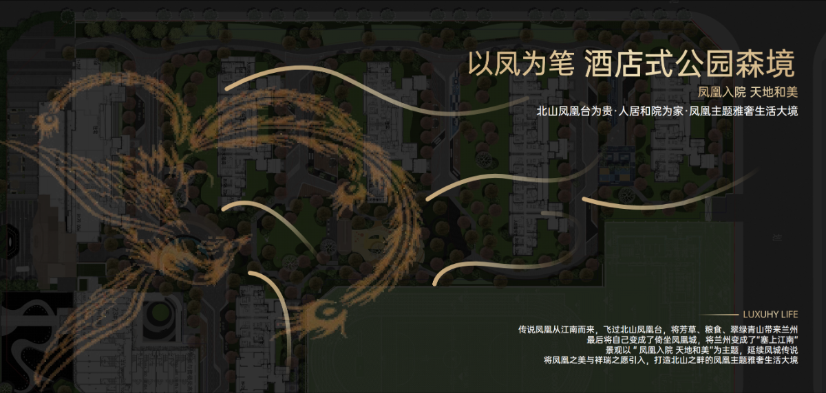 蘭州中海·樾境景觀設(shè)計(jì)以"鳳凰"為靈感主題,通過(guò)現(xiàn)代設(shè)計(jì)手法演繹傳統(tǒng)祥瑞意象,營(yíng)造尊貴、藝術(shù)且充滿自然生機(jī)的棲居環(huán)境。項(xiàng)目以"有鳳來(lái)儀"酒店式入口啟幕,通過(guò)鳳羽紋樣鋪裝、藝術(shù)雕塑與落客區(qū)設(shè)計(jì),打造尊貴歸家第一印象。"尋巢·鳳逐溪澗"以曲徑通幽的流線,融合疊水溪澗與層次豐富的植栽,營(yíng)造沉浸式歸家體驗(yàn)。核心景觀"鳳起云端"水院,以360度立體景觀系統(tǒng)構(gòu)筑社區(qū)活力中心,幽瀑、疊水與老榆樹(shù)形成自然背景,藝術(shù)廊架與環(huán)形座椅臨水而設(shè),成為集休憩、社交、觀景于一體的多功能藝術(shù)空間。整體設(shè)計(jì)注重材質(zhì)對(duì)比、光影效果與生態(tài)美學(xué),將現(xiàn)代輕奢格調(diào)與鳳凰文化的華美優(yōu)雅完美融合,打造出一處兼具儀式感與生活溫度的現(xiàn)代人居范本。